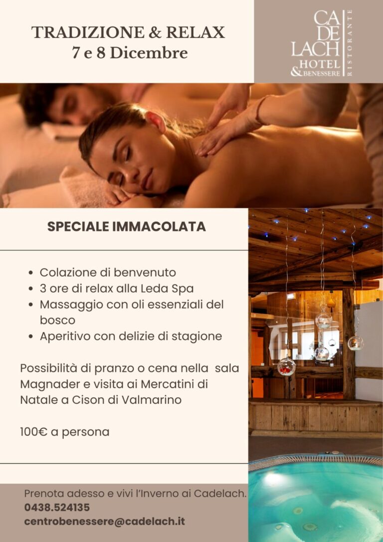 - Wellness and sensory path of 30 minutes with emotional shower scented with essential oils, 45° steam bath with scrub for two and vertical Kneip path, jacuzzi, 90° Finnish sauna, infrared sauna, relaxation niche with aroma and chromotherapy, Stube with herbal tea tasting and artisan pastries.